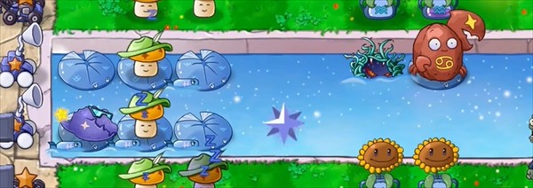 双鱼莲叶:初始拥有一颗鱼雷子弹,当前方3格内有僵尸时发射鱼雷子弹,能够击中潜水的僵尸,命中时造成200点伤害(可直接击杀1只普通僵尸)。