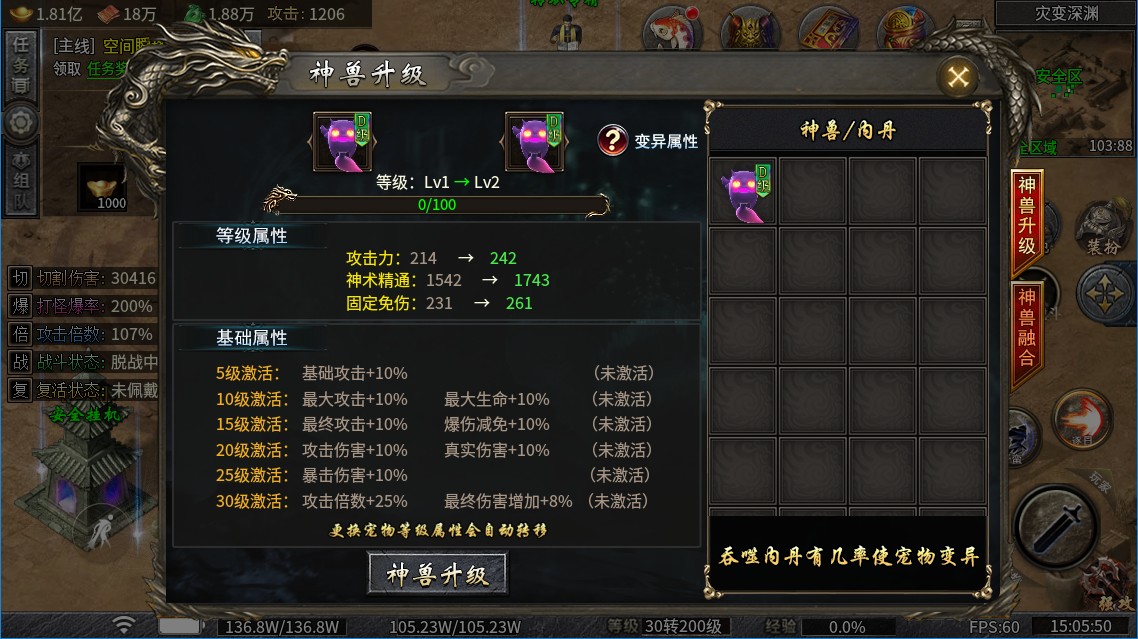 3、神兽升级至一定等级后可解锁大量属性加成。